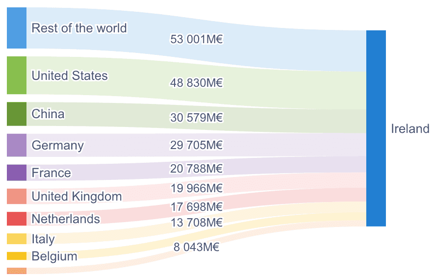 D’onnmhairigh Éire 354.2 billiún euro i dtáirgí agus seirbhísí idirmheánacha in 2023. Seo iad na príomhchustaiméirí eachtracha.