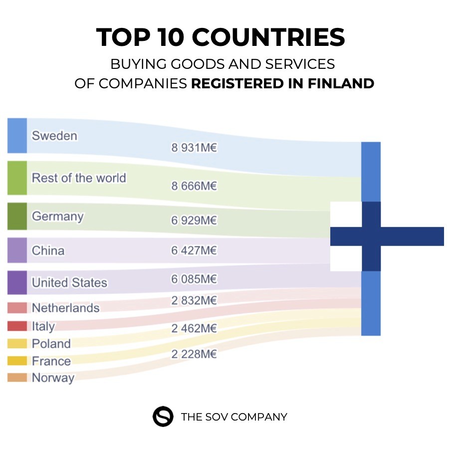 Suomi vei vuonna 2023 76,1 miljardin euron edestä välituotteita ja -palveluita ulkomaille. Seuraavat maat muodostavat merkittävimmät ulkomaiset asiakassuhteet.